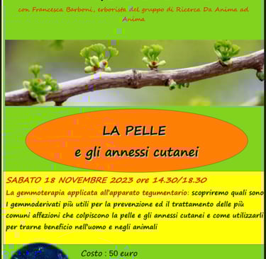 Lezione aperta a tutti, con questa prossima iniziativa in partenza sulla cura della pelle con i genmoderivati (sia per umani che animali). Lezione condotta dall’esperta erborista Francesca del nostro gruppo di studio 🌸 possibilità di seguire in diretta con collegamento zoom oppure in differita tramite registrazione. Saranno fornite dispense e materiale didattico. Iscrizioni entro e non oltre il 15 novembre.